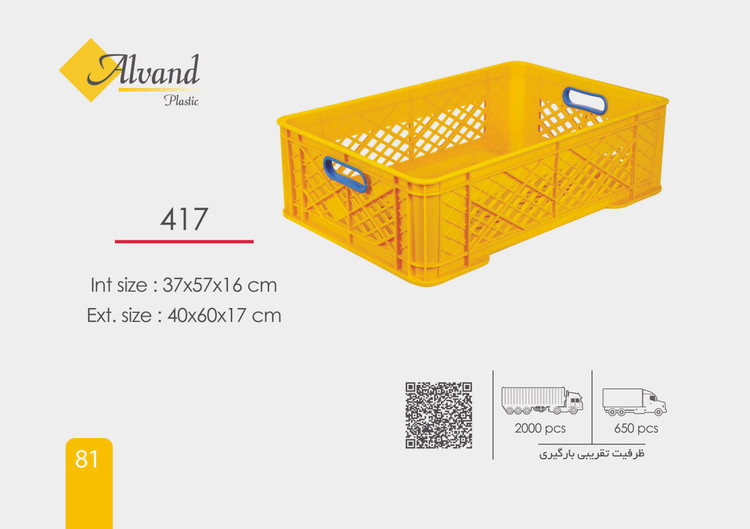 جعبه صنعتی پلاستیکی مدل 417 به منظور جابه جایی و حمل گوشت،مرغ،ماهی،میگو،در رستوران های بزرگ برای حمل غذا و … استفاده میگردد. این سبد در کشتارگاه ها به عنوان سبد کشتارگاهی و در شرکت های لبنی به عنوان سبدلبنیات شناخته میشود .